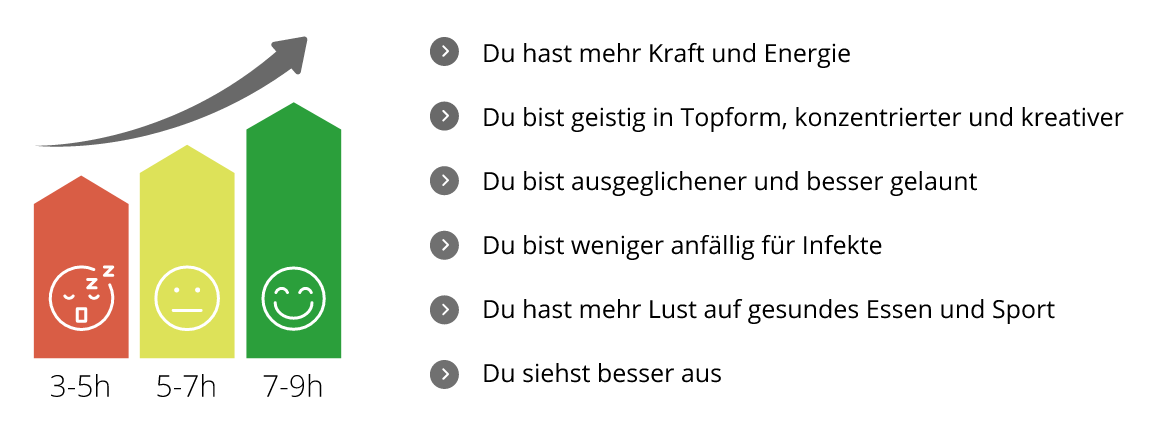 Wer Sport treibt, verbessert seine Schlafqualität. Das geht aus verschiedenen Studien eindeutig hervor. Doch es funktioniert auch anders herum. Wer zu wenig schläft, dem fehlt die Energie und damit die Lust auf Bewegung. Der Antrieb reicht nicht aus, um nach einem langen Arbeitstag noch Sport zu machen. Leistungssportler wissen: Genug Schlaf ist ein wichtiger Teil des Trainings. Sportliche Leistung bringt der Körper nur gut ausgeruht undausreichende Regeneration ist wichtig für die Muskulatur.